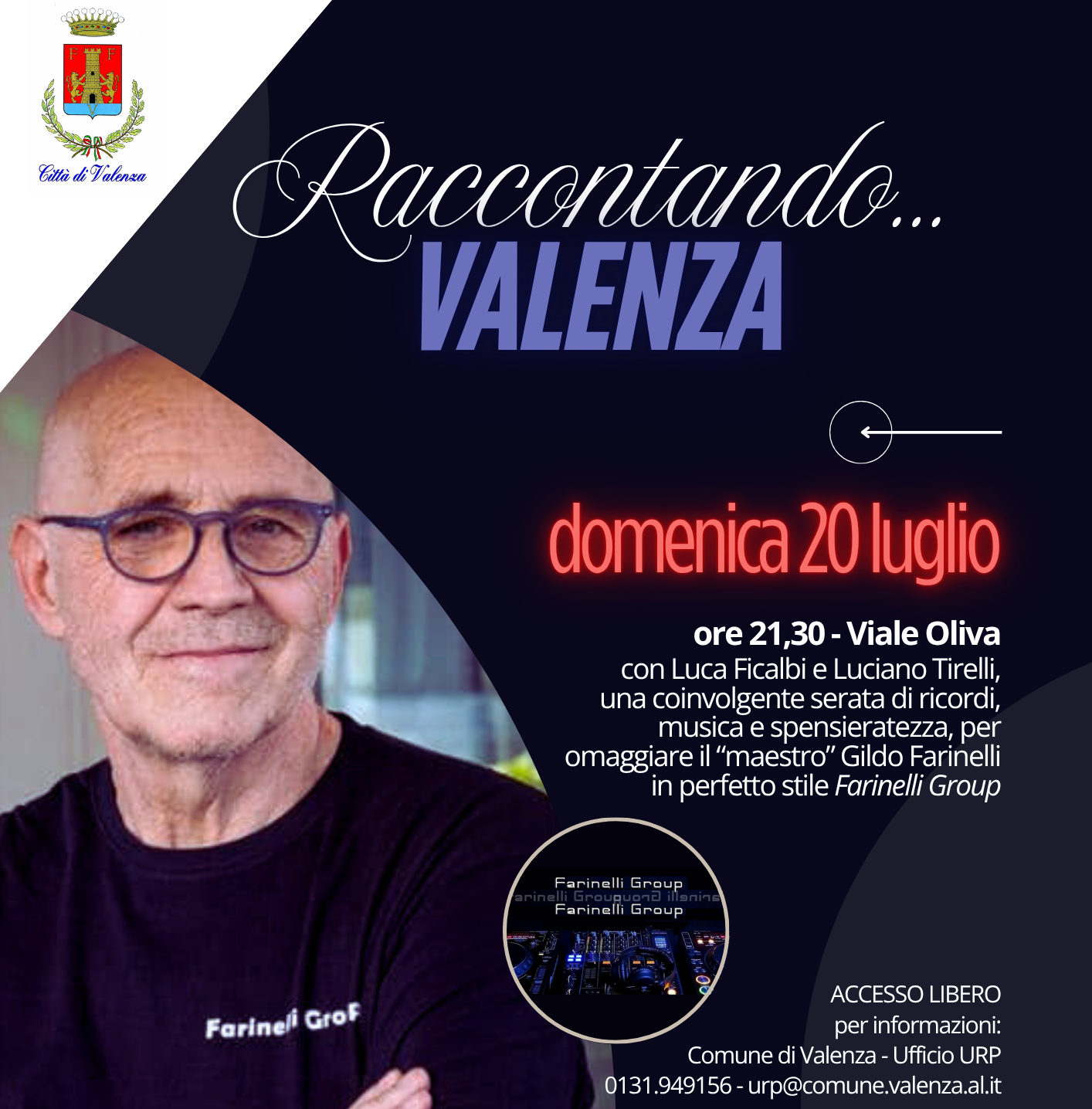 Domenica 20 luglio, invece, Luca Ficalbi e Luciano Tirelli ricorderanno il "maestro" Gildo Farinelli, storico fondatore di Radio Gold Valenza e apprezzato intrattenitore delle feste valenzane che quest'anno avrebbe compiuto 75 anni. Una serata ricca di ospiti, musica e tanta allegria, in perfetto stile Farinelli Group.