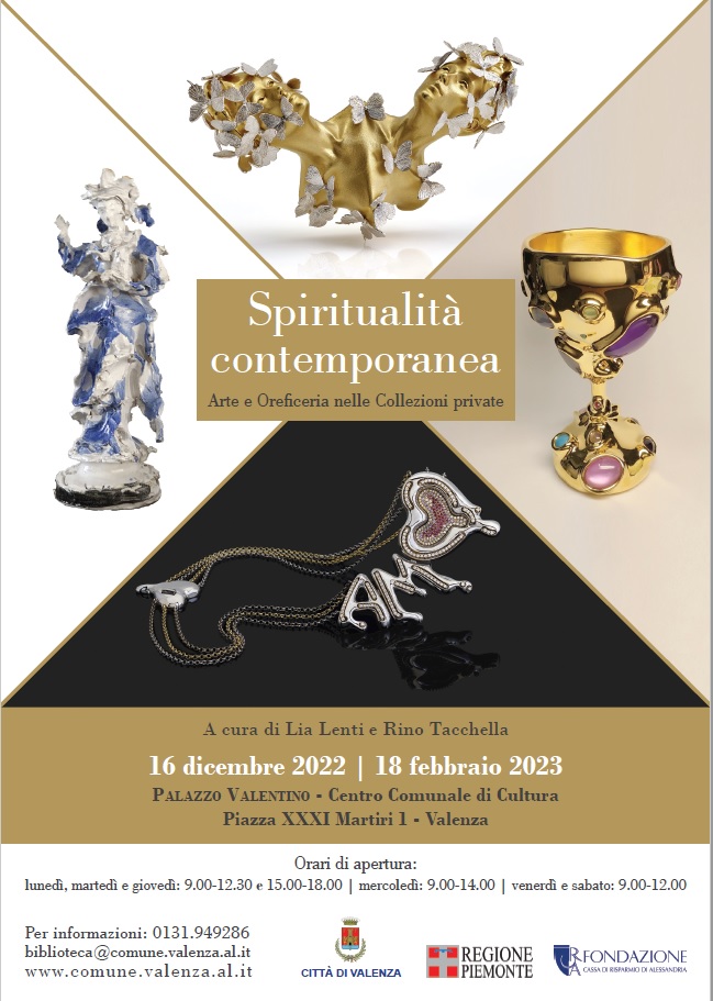 Inaugurerà venerdì 16 dicembre 2022 alle ore 17.30 la mostra Spiritualità contemporanea. Arte e oreficeria nelle collezioni private. La mostra promossa dal Comune di Valenza e curata da Lia Lenti e Rino Tacchella, sarà la prima importante iniziativa realizzata in occasione delle celebrazioni per i quattrocento anni dalla fondazione del Duomo di Santa Maria Maggiore di Valenza.