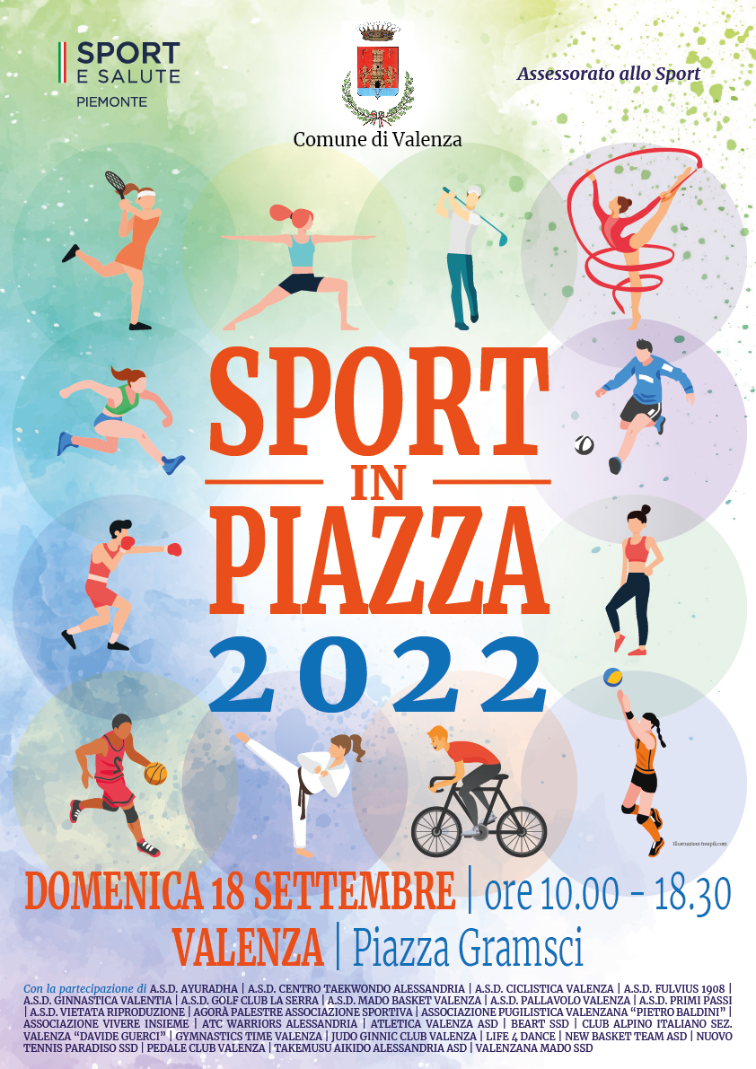 “Sport in Piazza” è un evento organizzato dall’Amministrazione Comunale – Assessorato alla Sport, che avrà luogo Domenica 18 settembre dalle ore 10.00 alle ore 18.30 in Piazza Gramsci a Valenza.