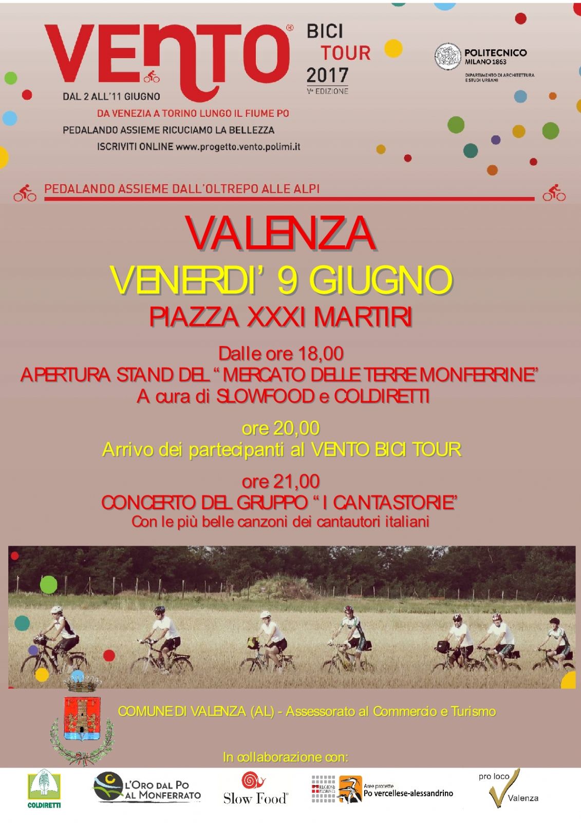 I partecipanti al VENTO BICI TOUR, arriveranno a Valenza, in Piazza XXXI Martiri verso le ore 20,00 e l’Amministrazione comunale – Assessorato al Commercio e Turismo, ha organizzato una serata di accoglienza ai cicloturisti che potranno degustare a Palazzo Valentino prodotti di presidi Slowfood ed altre eccellenze enogastronomiche delle terre monferrine ma anche di intrattenimento per tutta la cittadinanza e gli appassionati delle due ruote.