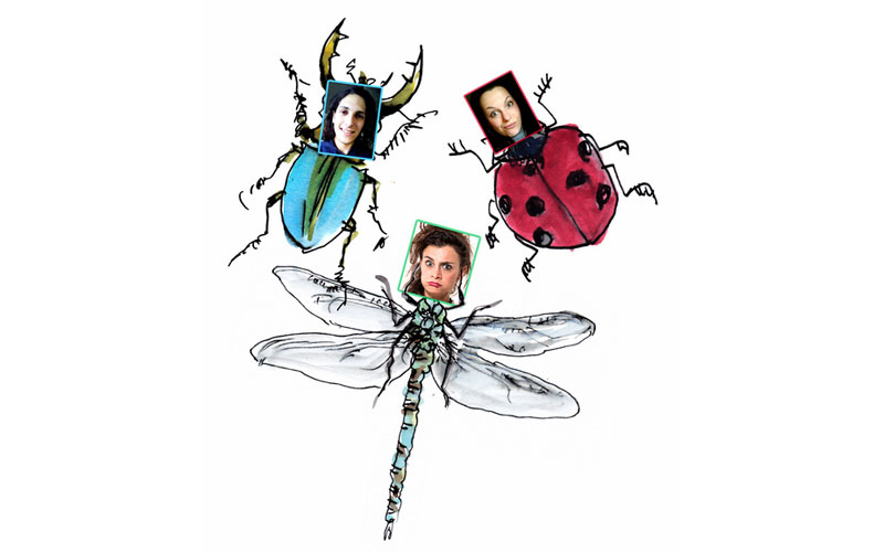 Lo spettacolo si sviluppa attraverso il gioco del travestimento che gli attori fanno utilizzando semplici attrezzi da giardino, in questo modo riusciranno ad accennare con ironia ad aspetti particolari della vita degli insetti, pur mantenendo la leggerezza del divertimento teatrale e l’equilibrio tra i tre personaggi, due sorelle “sapientine” fraternamente coalizzate contro il maschietto.