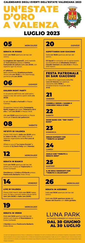 «Per il mese di luglio l’Amministrazione comunale ha voluto organizzare, in collaborazione con le associazione del territorio e i commercianti, una serie di appuntamenti per le vie del centro storico, tra musica e intrattenimento, per offrire una proposta culturale, turistica e commerciale innovativa che renda Valenza sempre più attrattiva come centro zona. In quest’ottica di cooperazione Valenza si è unita al circuito dei centri zona con Tortona e Ovada per animare le serate d’estate in una staffetta settimanale di eventi. Un modo per coinvolgere cittadini e non a vivere le sere d’estate in città» così commentano il Sindaco Maurizio Oddone e l’Assessore alle Manifestazioni Alessia Zaio.
