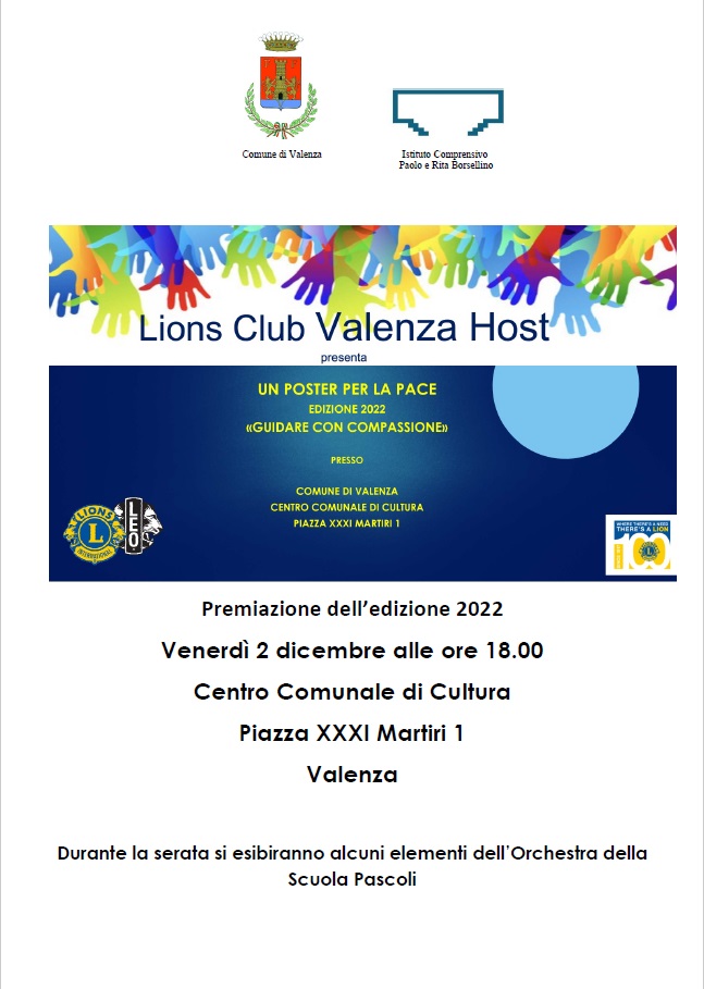 Venerdì 2 dicembre 2022 alle ore 18.00 presso il Centro Comunale di Cultura di Valenza (piazza XXXI Martiri 1), avrà luogo la fase conclusiva del Concorso indetto da Lions Club International UN POSTER PER LA PACE.
