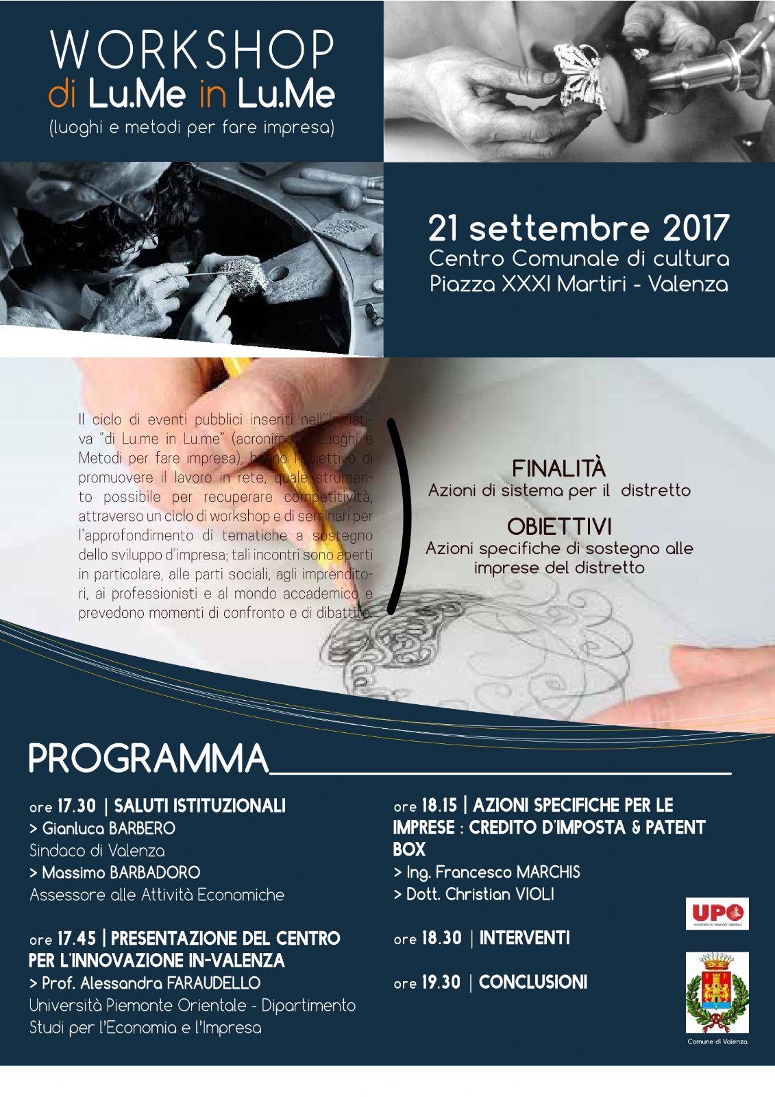 Il ciclo di eventi pubblici inseriti nell’’iniziativa “di Lu.me in Lu.me” (acronimo di Luoghi e Metodi per fare impresa), hanno l’obiettivo di promuovere il lavoro in rete, quale strumento possibile per recuperare competitività , attraverso un ciclo di workshop e di seminari per l’approfondimento di tematiche a sostegno dello sviluppo d’impresa;