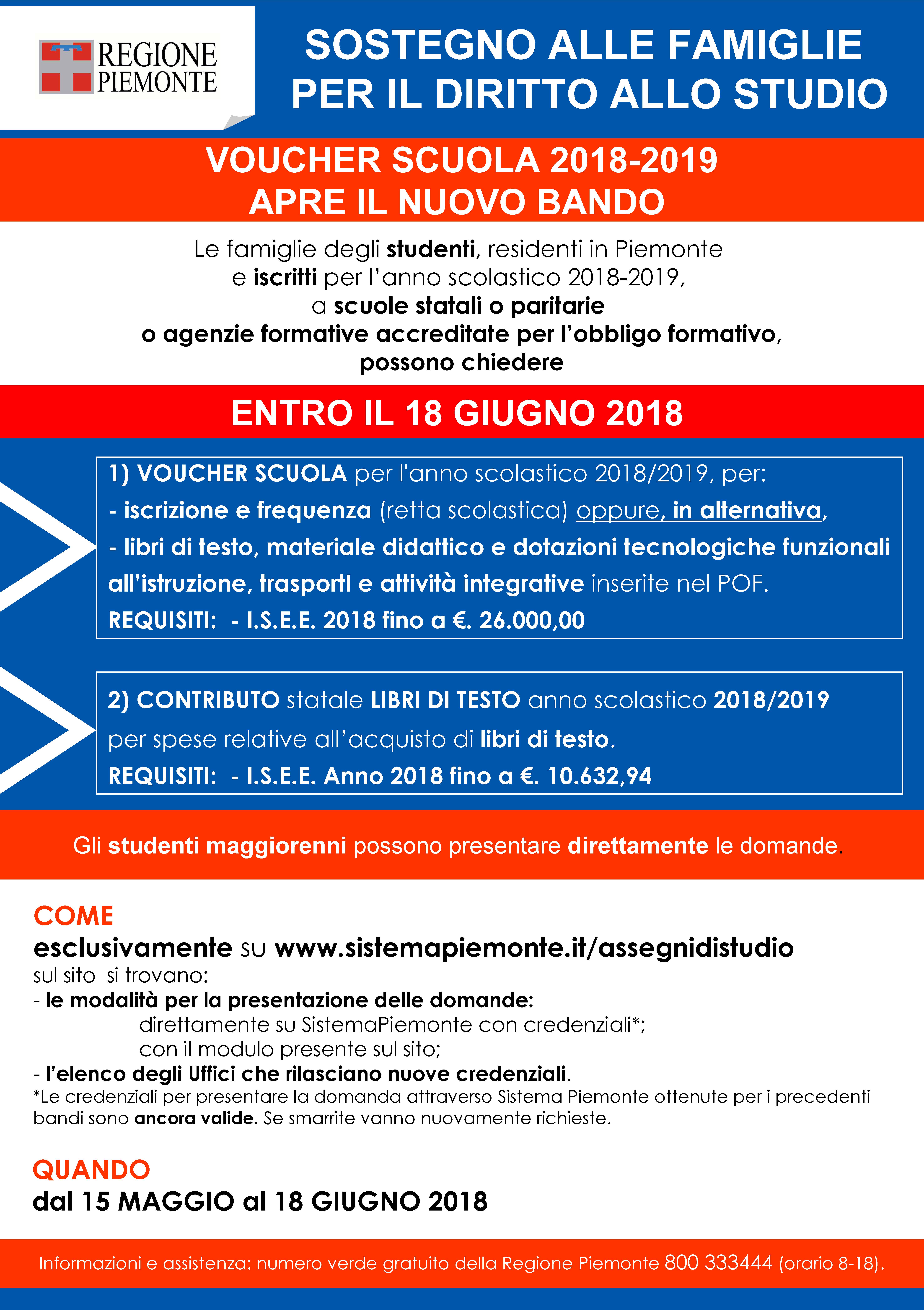 Le famiglie degli studenti, residenti in Piemonte e iscritti per l'anno scolastico 2018-2019, a scuole statali o paritarie o agenzie formative accreditate per l'obbligo formativo, possono presentare entro il 18 GIUGNO 2018,la domanda per il VOUCHER SCUOLA e per il CONTRIBUTO STATALE PER L'ACQUISTO DEI LIBRI DI TESTO. La domanda può essere presentata se in possesso della dichiarazione I.S.E.E. anno 2018.Occorre accedere con le opportune credenziali all'applicazione www.sistemapiemonte.it/assegnidistudio. Per informazioni e assistenza:numero verde Regione Piemonte 800 333444 (orario 8-18) - Ufficio Servizi Educativi 0131 949373 (orario 10.30 - 13.45)