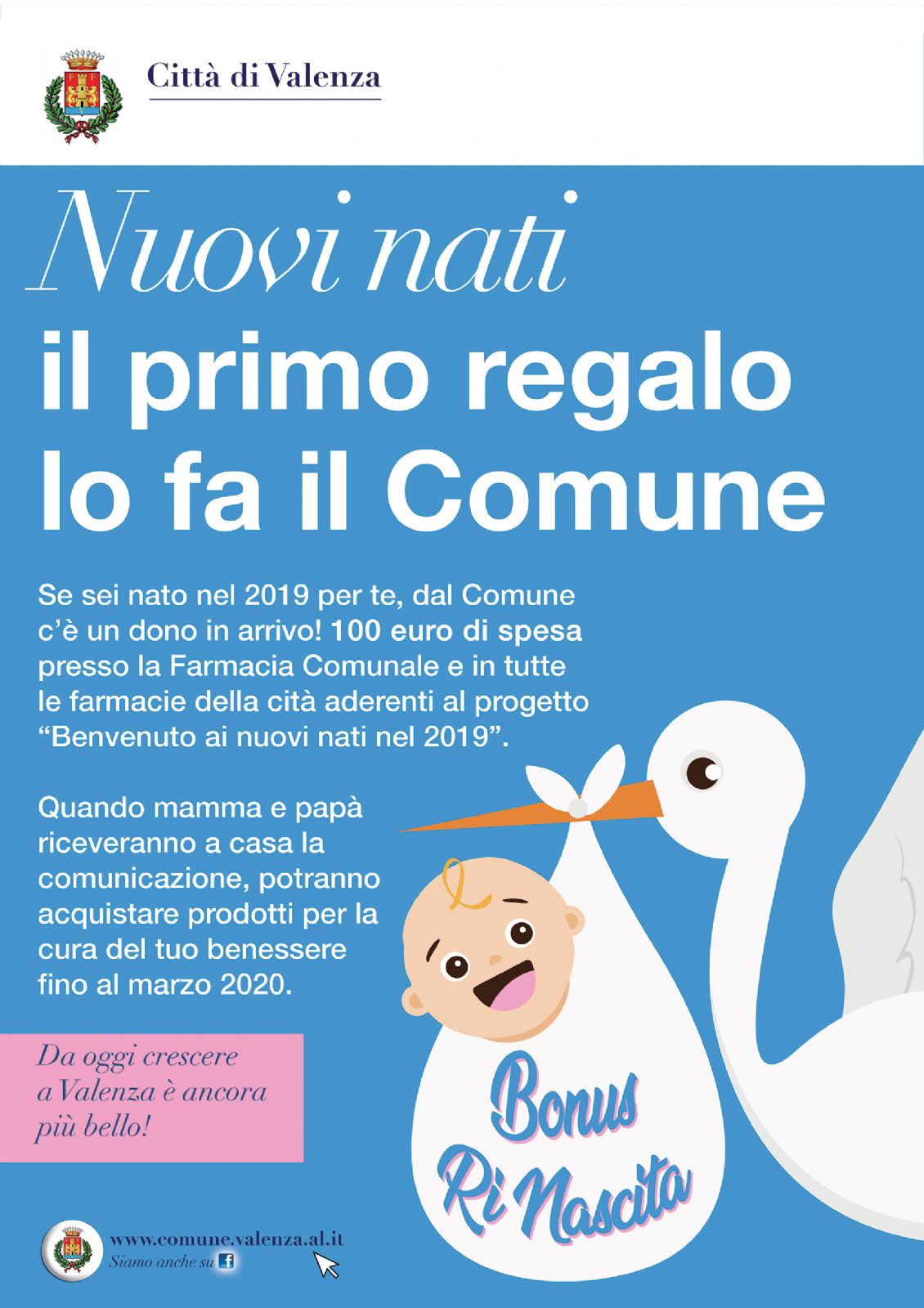 Si tratta di un buono spesa da 100 euro che le famiglie con bebè nati nel 2019 possono spendere nella Farmacia Comunale e nelle altre farmacie valenzane aderenti all'iniziativa.