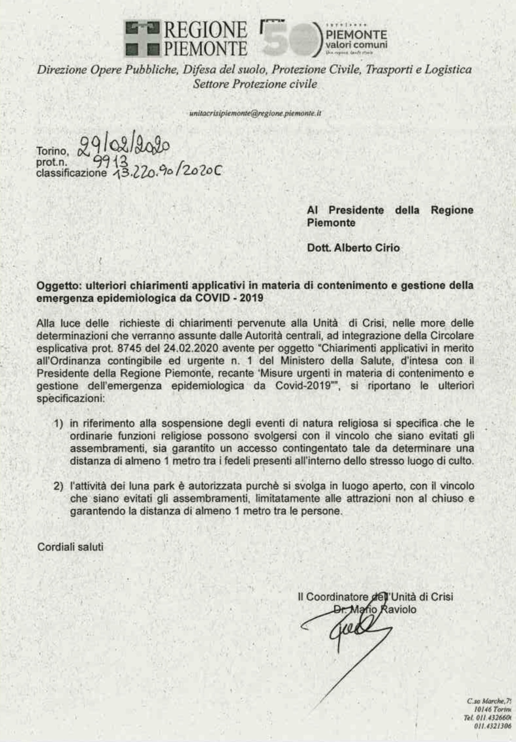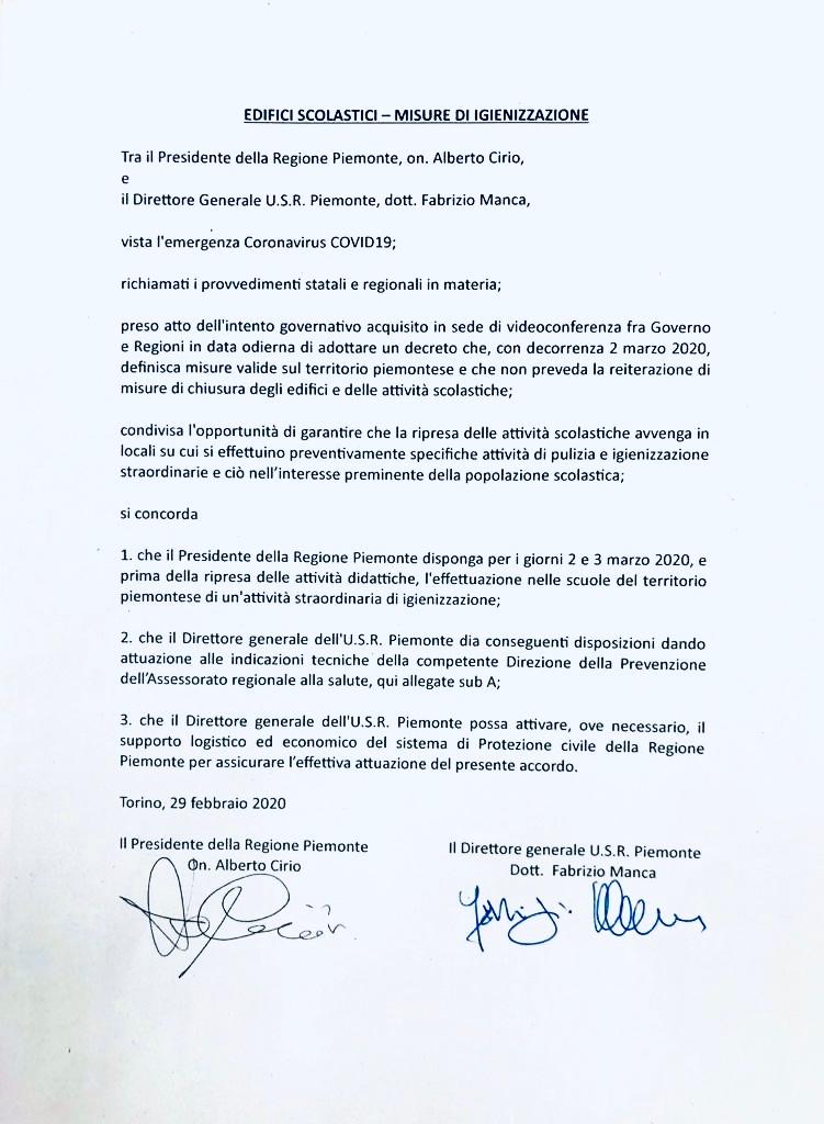 Per le scuole il Piemonte ha adottato una misura autonoma di concerto con l’Ufficio scolastico regionale e sentiti anche il Presidente del Consiglio e il Ministro della Salute: lunedì e martedì riapriranno gli edifici scolastici al personale per consentire l’organizzazione delle attività e l’igienizzazione delle aule e degli ambienti scolastici. Da mercoledì riprenderanno regolarmente anche le lezioni.