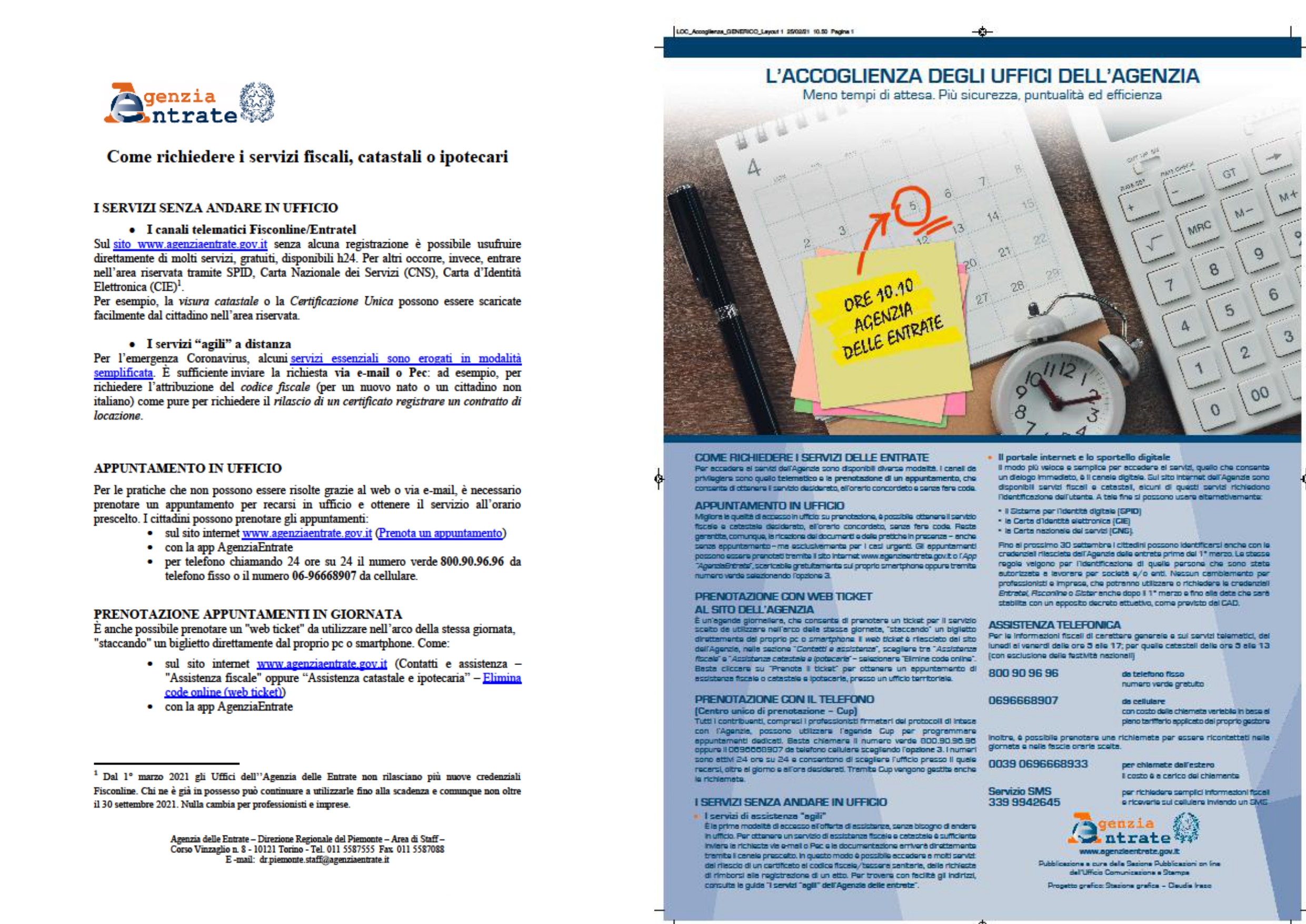 Si riporta in allegato il volantino contenente i servizi al pubblico forniti dagli uffici dell'Agenzia delle Entrate e le modalità per ottenere un appuntamento presso le loro sedi.