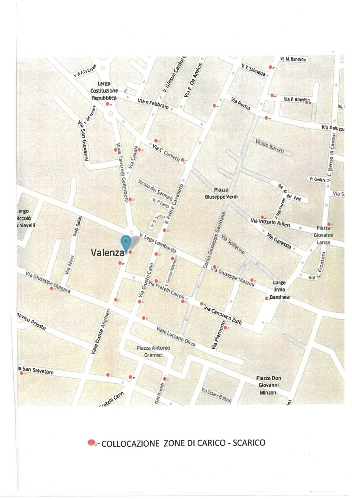 Per opportuna informazione ai titolari delle attività commerciali e ai trasportatori di merci, pubblichiamo la mappa dei punti di carico e scarico presenti a Valenza.