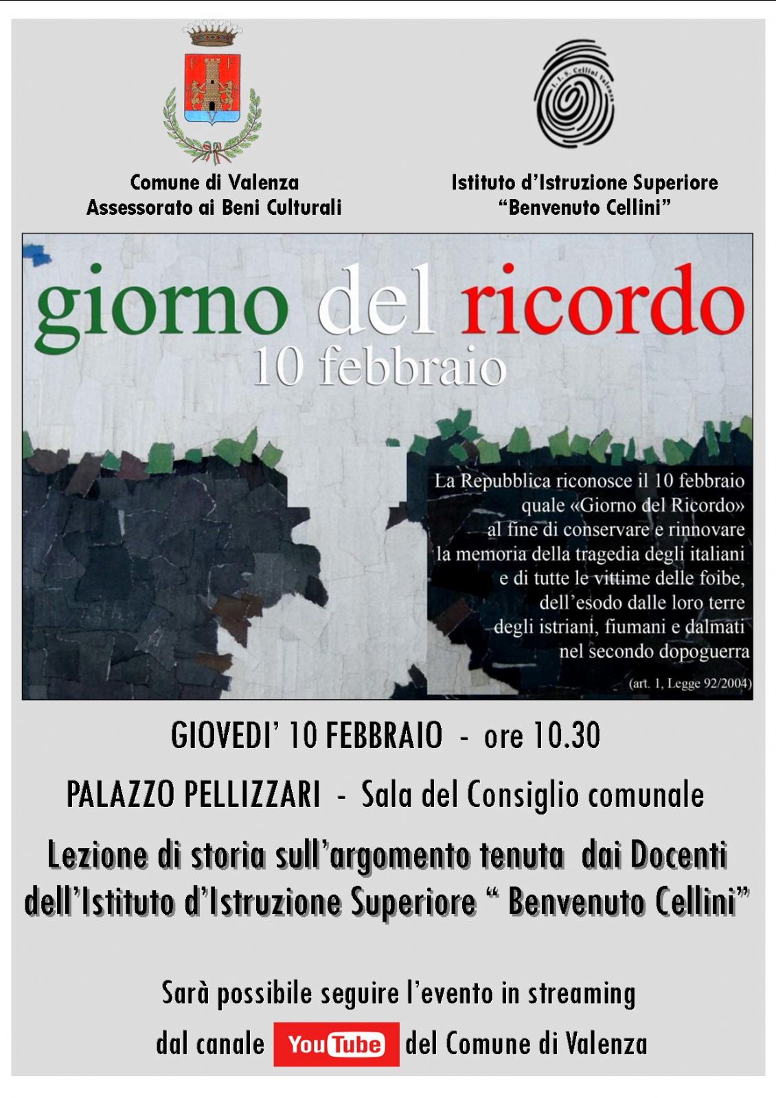 Anche il Comune di Valenza, in collaborazione con l'Istituto d'Istruzione Superiore "Cellini" hanno voluto ricordare tale giornata con una lezione su questo argomento, tenuta dai docenti dell'Istituto "Cellini" che sui terrà giovedì 10 febbraio, alle ore 10.30 nella sala consiliare di Palazzo Pellizzari.