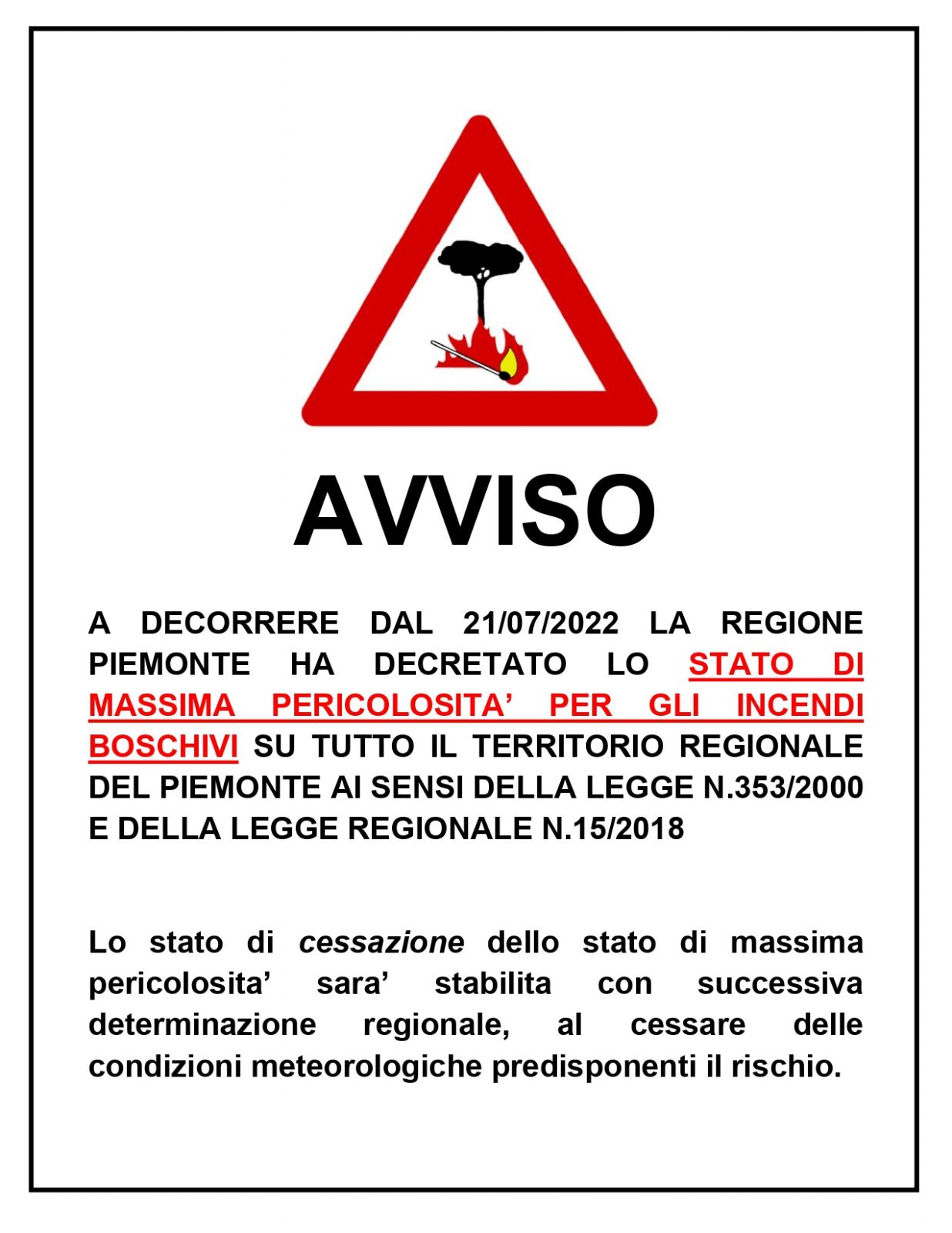 A DECORRERE DAL 21/07/2022 LA REGIONE PIEMONTE HA DECRETATO LO STATO DI MASSIMA PERICOLOSITA’ PER GLI INCENDI BOSCHIVI SU TUTTO IL TERRITORIO REGIONALE DEL PIEMONTE AI SENSI DELLA LEGGE N.353/2000 E DELLA LEGGE REGIONALE N.15/2018