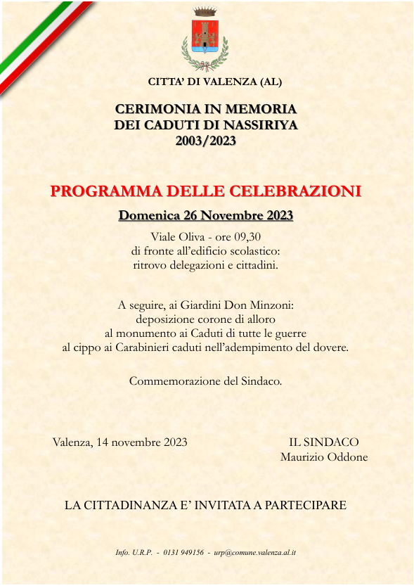 Domenica 26 novembre si terrà a Valenza la cerimonia in ricordo dei caduti di Nassiriya con il seguente programma: