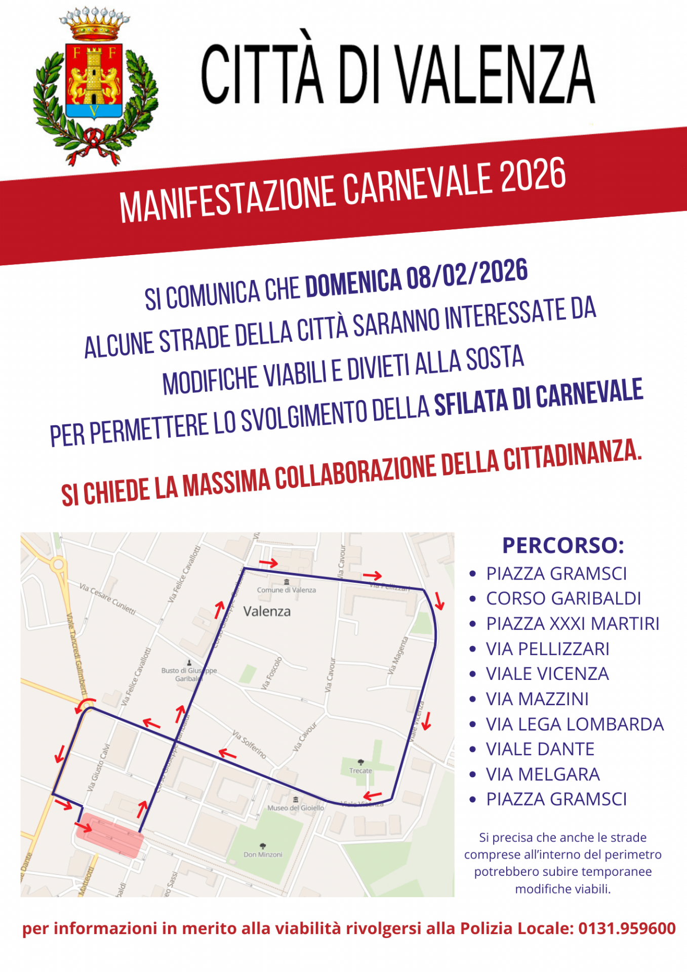 Si comunica che domenica 8 febbraio alcune strade della città saranno interessate da modifiche viabili e divieti alla sosta per permettere lo svolgimenti della manifestazione denominata "CarneValenza".
