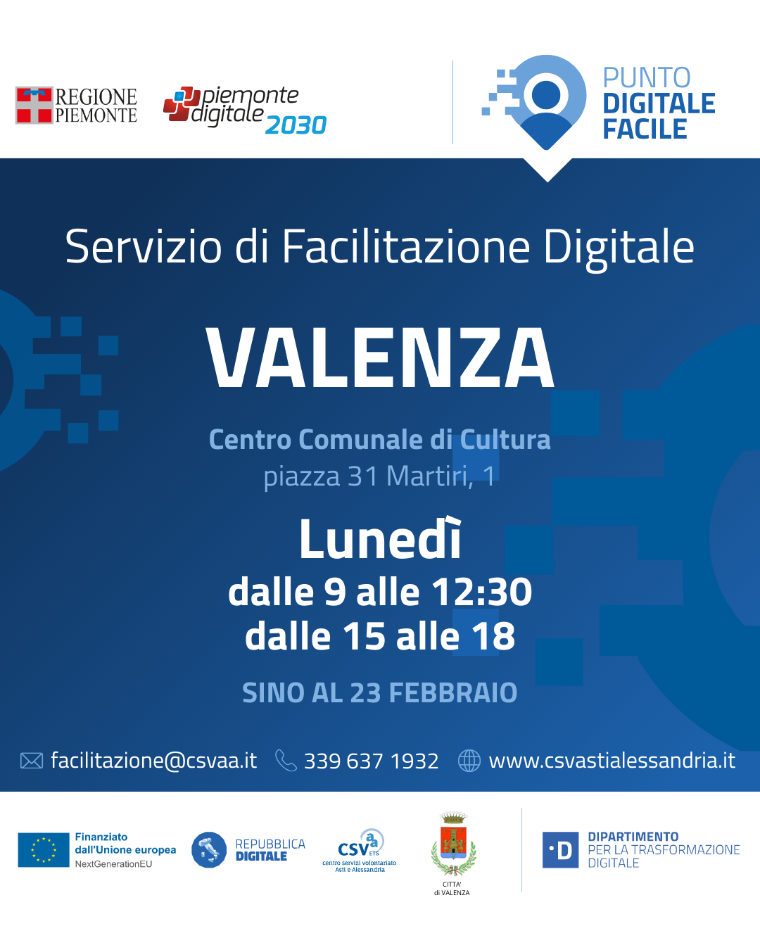 E' stato prorogato fino alla fine del mese di febbraio il "Punto Digitale Facile", a cura del Centro Servizi Volontariato Alessandria e Asti, Presso il Centro Comunale di Cultura.