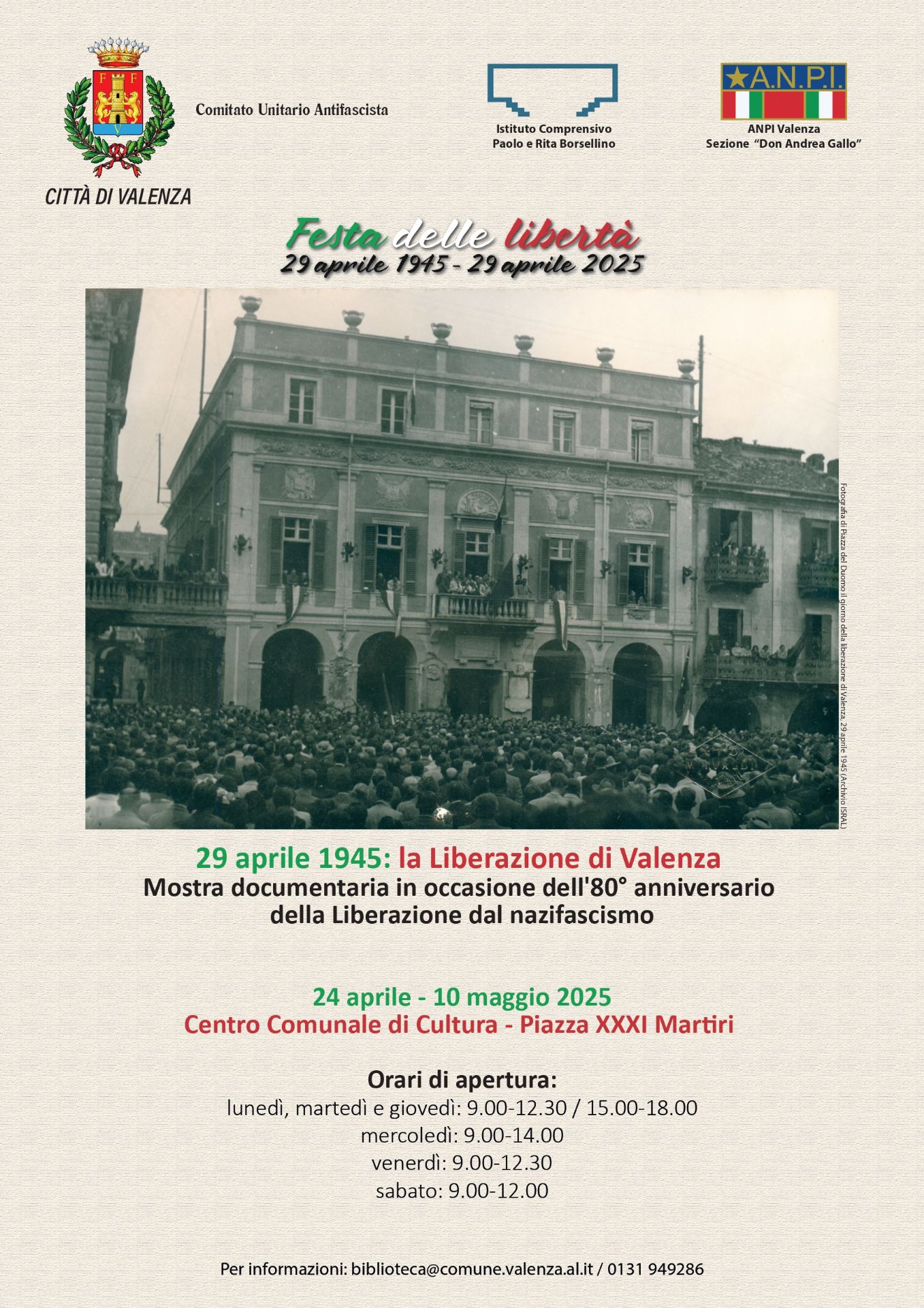 Il primo appuntamento sarà giovedì 24 aprile alle ore 18.00 presso il Centro Comunale di Cultura con l’inaugurazione della mostra “29 aprile 1945: la Liberazione di Valenza”, mostra documentaria sulla Liberazione della città dal nazifascismo.