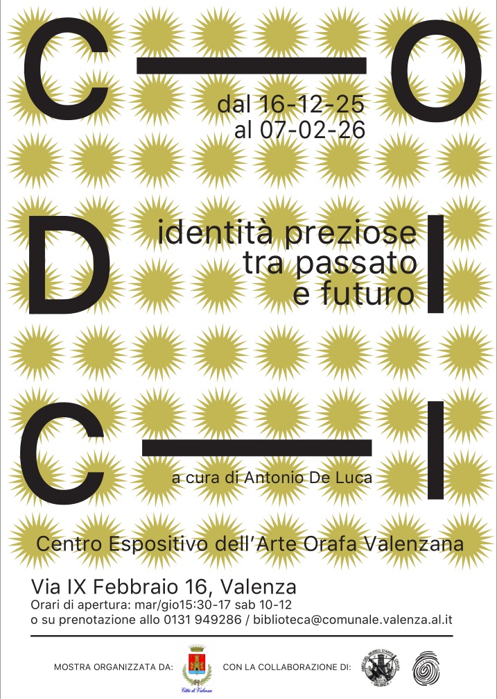 Sarà inaugurata martedì 16 dicembre alle ore 18.30 presso il Centro Espositivo dell’Arte Orafa Valenzana la mostra “CODICI – identità preziose tra passato e futuro” a cura di Antonio De Luca.