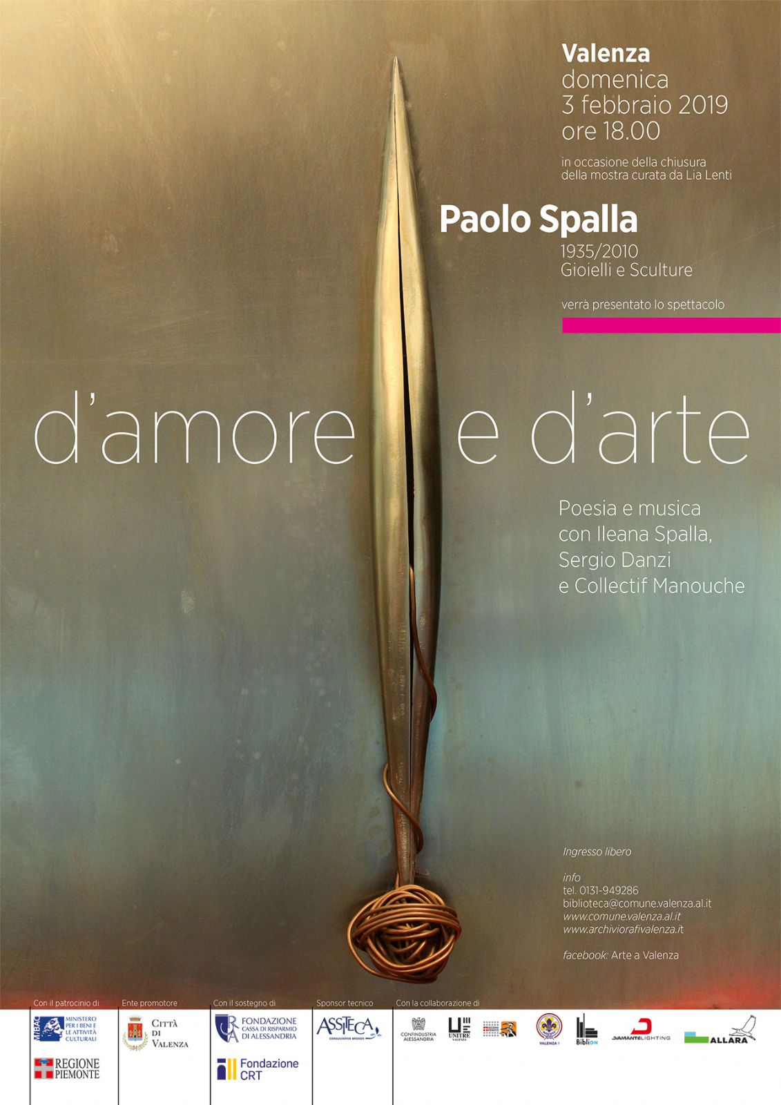 In occasione del finissage della mostra "Paolo Spalla 1935/2010. Gioielli e Sculture", domenica 3 febbraio 2019 alle ore 18.00, presso lo spazio espositivo di Palazzo Valentino - Centro Comunale di Cultura verrà presentato lo spettacolo "D'AMORE E D'ARTE" poesia e musica con ILEANA SPALLA, SERGIO DANZI e COLLECTIF MANOUCHE.