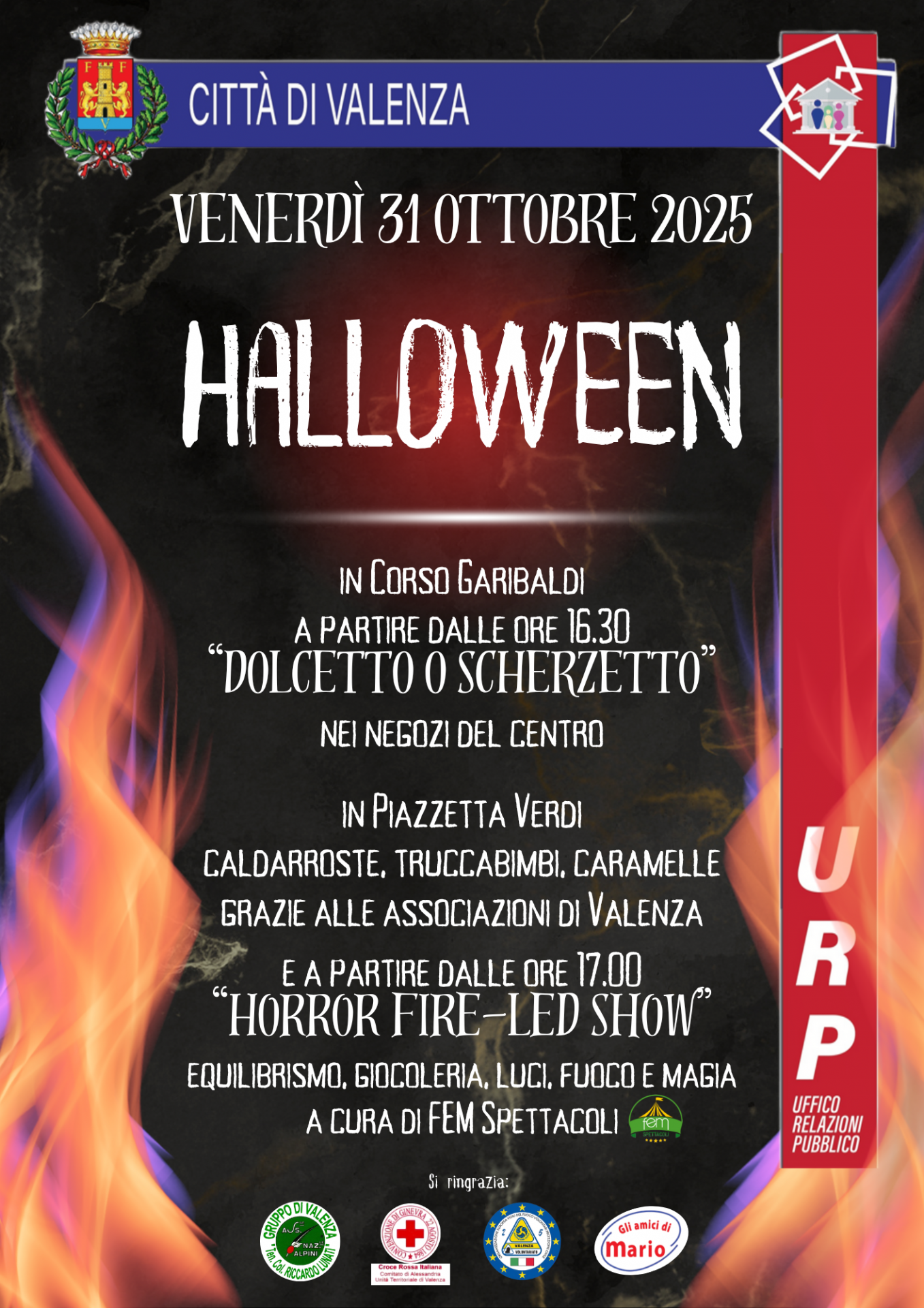 Magia e animazione per tutte le età, caldarroste, truccabimbi e caramelle per tutti grazie al Gruppo Alpini di Valenza, Croce Rossa, Amici di Mario e Protezione Civile.