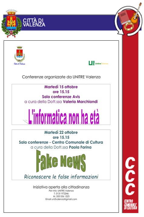 Il secondo appuntamento, “Fake news – Riconoscere le false informazioni”, è previsto per martedì 22 ottobre alle ore 15.15 presso la Sala conferenze del Centro Comunale di Cultura. La conferenza, a cura della Dott.ssa Paola Farina, anche lei collaboratrice di Specchio dei Tempi de La Stampa, sarà una lezione su come difendersi e riconoscere le fake news che popolano il web.